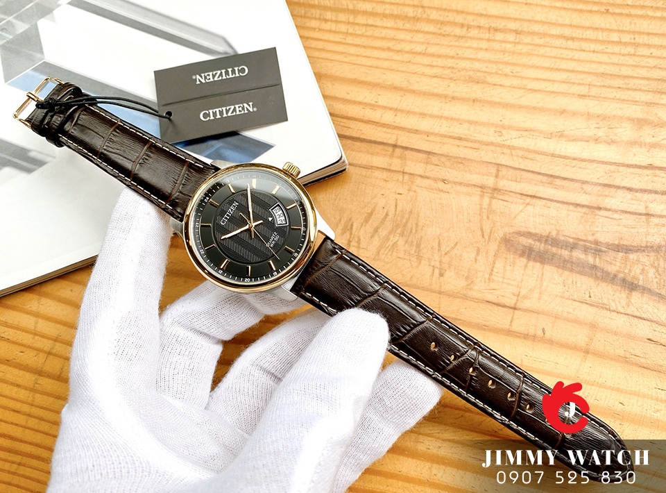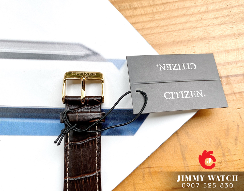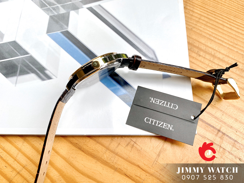Đồng hồ dành cho Nam Citizen JP BI1054-12E có vỏ kim loại mạ vàng sang trọng, kim chỉ và vạch số phủ vàng nổi bật trên nền đen, kết hợp với dây đeo bằng chất liệu da màu đen đem lại phong cách lịch lãm cho phái mạnh.