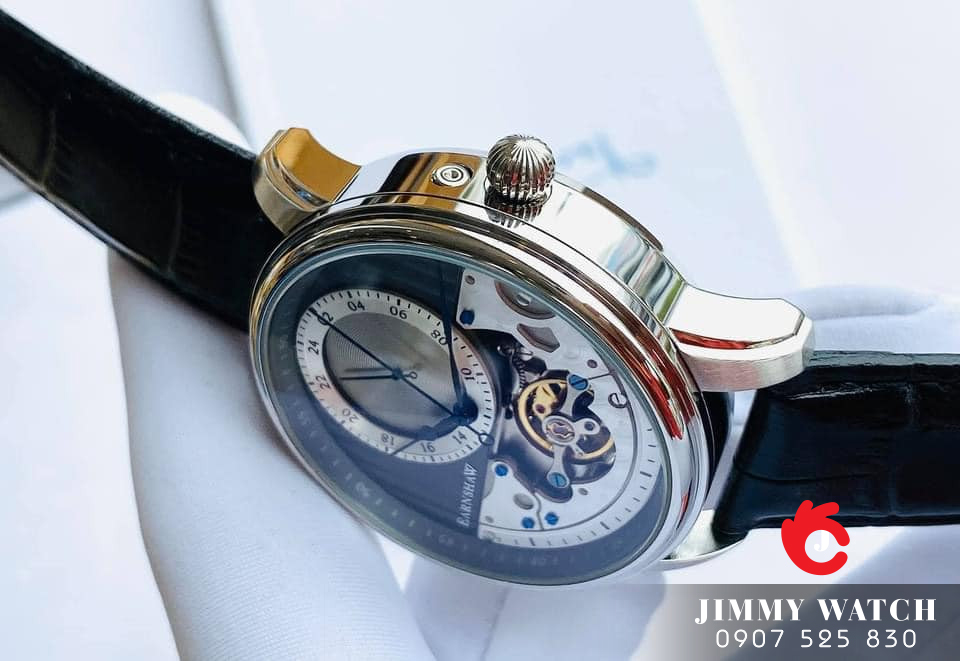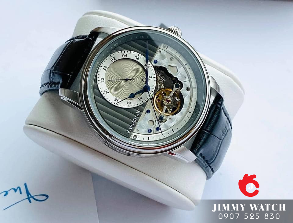 Tổng thể chiếc đồng hồ được chia thành 2 phần riêng biệt với phần trên là đồng hồ 24h, phần dưới được thiết kế lộ máy với các chi tiết sắc sảo.